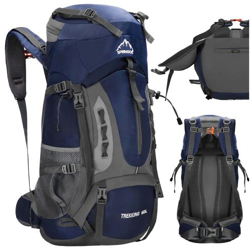 A fedél elejének tetején fehér hímzett Springos logó, alul pedig a TREKKING 60L felirat található.