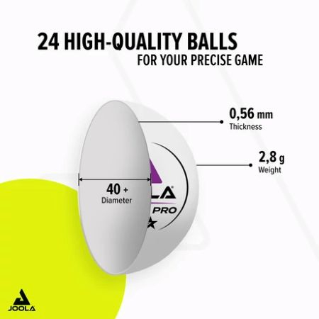 Prémium minőségű JOOLA 3-STAR PRO 40+ asztalitenisz (pingpong) labdák 12 db-os kiszerelésben. Kemény ABS műanyag anyag a hosszú élettartamért és az egyenletes, megbízható labdamenetekért.