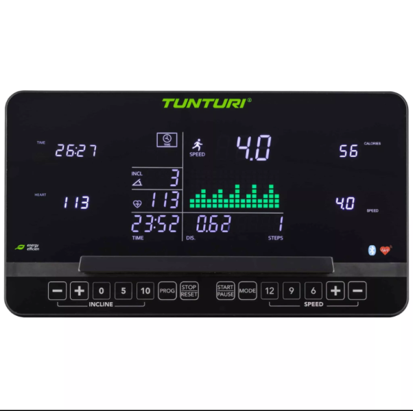 A Tunturi Signature T60 futópad a Tunturi futópadjainak jeles képviselője. A 15 fokozatban elektromosan dönthető 50 x 140 cm-es ízületkímélő futófelülethez és 20 km/h-ás végsebességhez egy nagyon erős 5 LE csúcsteljesítményű motor adja a megbízható és egyenletes meghajtást, mely akár 135 kg-os felhasználó alatt is teljesen egyenletesen működik. A 44 programmal amelyből 36 előre programozott, 3 felhasználói program, 1 gyors indítás program, 1 zsírégető program, 1 távolság, kalória, idő visszaszámláló programmal rendelkező, tablet tartóval és USB töltővel is ellátott komputer már Bluetooth kapcsolattal is rendelkezik, így akár több különböző applikációval is összekapcsolható. Mindezen felül a felhasználónak lehetősége van saját programot is készíteni és elmenteni a Tunturi T60 futópad komputerébe, melyet bármikor módosíthat is az aktuális fittségi állapotától függően.