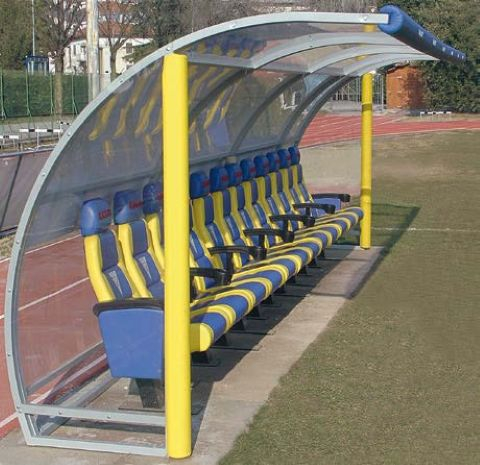 Egy professzionális, 12 méter hosszú labdarúgó cserepad , amelyet kifejezetten sportpályák mellé terveztek a cserejátékosok és a szakmai stáb számára.
