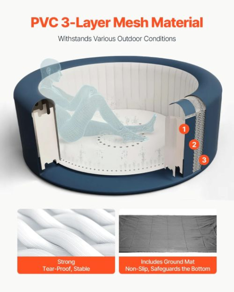 Tartós anyag: Kiváló minőségű, háromrétegű PVC hálós anyagból készült, ez a kültéri pezsgőfürdő szakadásálló, strapabíró, és különféle kültéri körülményeknek is ellenáll. Tartós, és egy talajvédő szőnyeggel rendelkezik a kád aljának védelmére.