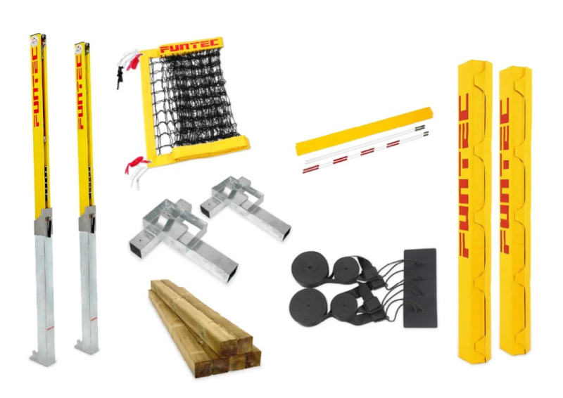 Komplett professzionális strandröplabda hálórendszer levehető talajvédő hüvelyekkel és szabadon álló City Beach rendszerrel, beleértve a hálóoszlopokat, talajvédő hüvelyeket, talplemezeket, gerendákat, Pro Beach Net PLUS-t, tépőzáras antennákat PLUS-t, pályavonal- és hálóoszlopvédőket.