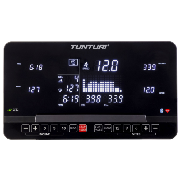 A Tunturi Platinum T20-as professzionális futópadot hatékony, teljes testet átmozgató edzésekhez tervezték, lelkes és céltudatos sportolók számára. A futófelület kimagasló ízületvédő csillapító rendszerrel rendelkezik, ami jelentősen csökkenti a testre ható káros terhelést és segít megelőzni az ízületi fájdalmakat. A nagy teljesítményű 4 LE-s AC motor megbízható és stabil működést biztosít  még a különösen nagy testsúllyal rendelkező felhasználók esetén, alacsony sebességi tartományban is. A látványos 10″-os  átmérőjű színes háttérvilágításos LCD/LED kijelző és a 47 különböző elérhető program, pulzus kontrollált edzésmódok, illetve különböző fitnesz tesztekkel, tökéletes választássá teszi a Platinum T20-as futópadot intenzív használat mellett is.