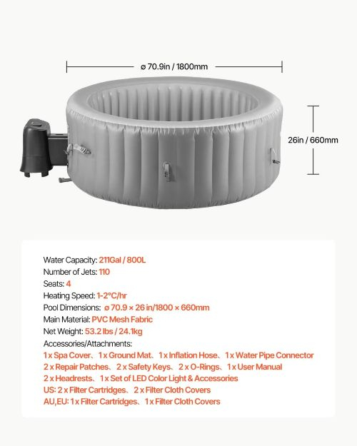 Felfújható pezsgőfürdő: Ez a 70,9 x 26 hüvelykes felfújható pezsgőfürdő akár 4 fő befogadására is alkalmas, és 110 nyugtató buborékfúvókával rendelkezik. Maximális vízhőmérséklete 104℉, víztartalma 211 gallon / 800 liter, így pihentető pezsgőfürdőzési élményt nyújt.