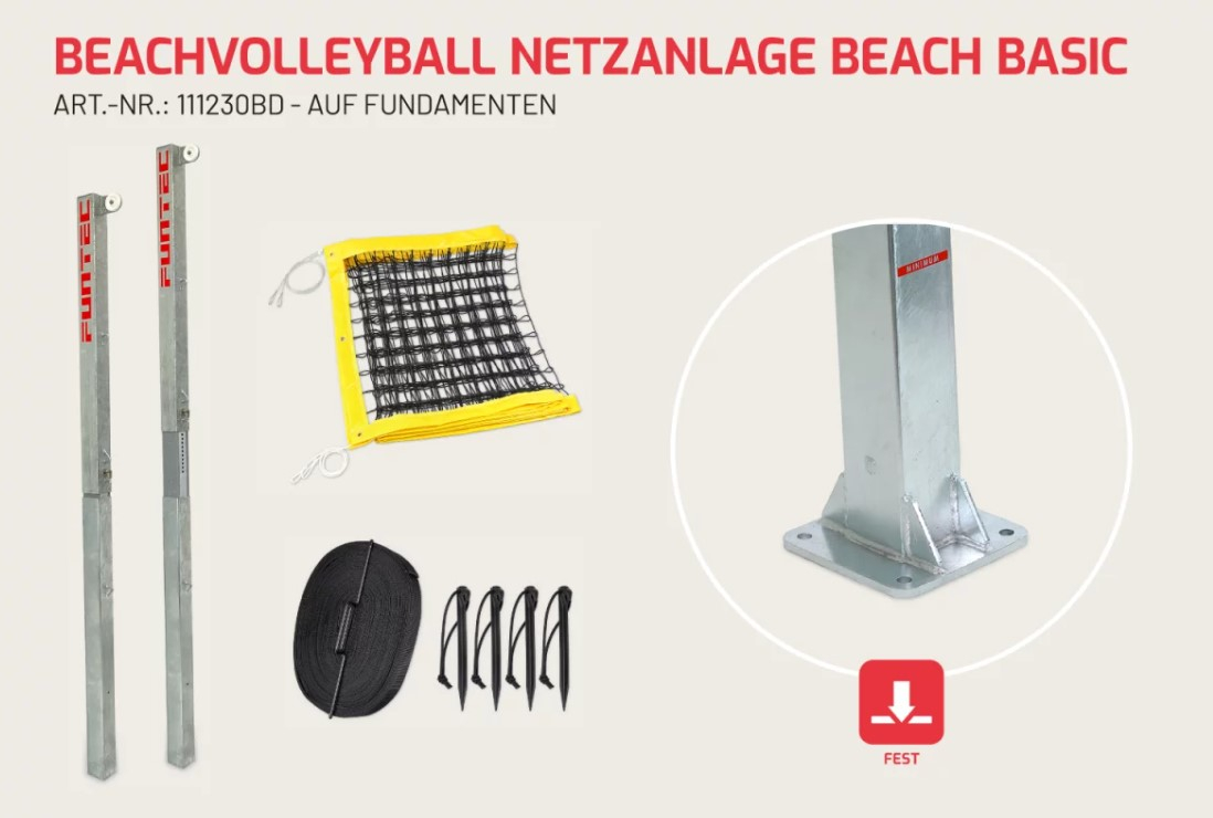 Állandó strandröplabda-hálórendszer tervezéséhez szabadidős sportokhoz ezt a komplett Beach Basic hálórendszer-készletet ajánljuk, amely talajhüvelyekkel van ellátva az alapokra csavarozáshoz.