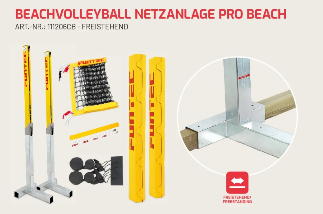 Akár utólagos átalakításról, rendezvényekre, vagy egyszerűen csak egy szabadon álló, alapozás nélküli strandröplabda-háló-rendszerről van szó – ezt kapja meg ezzel a komplett Pro Beach hálórendszerrel, szabadon álló talajvédő hüvelyekkel.