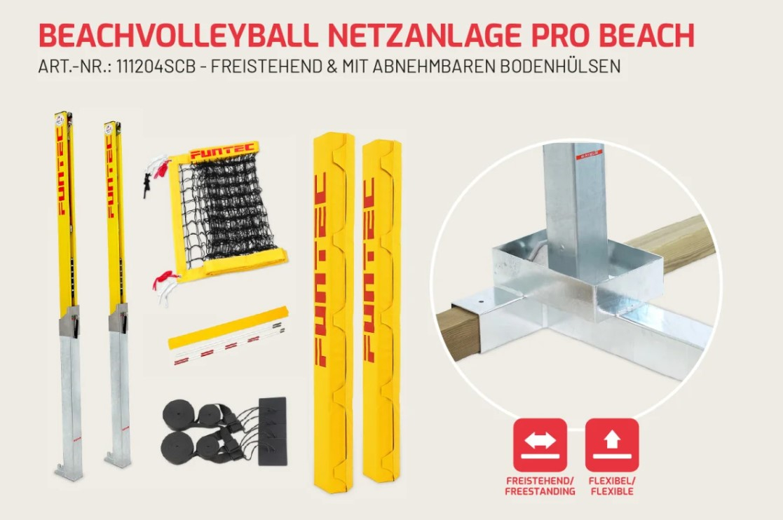 Komplett professzionális strandröplabda hálórendszer levehető talajvédő hüvelyekkel és szabadon álló City Beach rendszerrel, beleértve a hálóoszlopokat, talajvédő hüvelyeket, talplemezeket, gerendákat, Pro Beach Net PLUS-t, tépőzáras antennákat PLUS-t, pályavonal- és hálóoszlopvédőket.