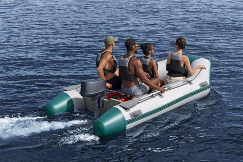 Rendkívül tartós, nagy sűrűségű, napálló anyagból készült, háromrétegű megerősített anyagból, poliészter hálóval, tartós PVC rétegekkel bevonva a könnyűség és szilárdság érdekében. A motortartóval ellátott rétegelt lemez fartükör megtartja a motort (a motor nem tartozék). A padló olyan erős és kényelmes, mint egy hagyományos csónak, miközben könnyű és ellenáll az időjárás viszontagságainak. A 3 légkamrás kialakítás tökéletes egyensúlyt biztosít a csónaknak a vízben, és megakadályozza, hogy a csónak egyetlen defekt esetén is gyorsan felboruljon. A csónak elejéhez acél vontatószem van rögzítve a vontatáshoz és a rögzítéshez. A biztonsági kötelek lehetővé teszik a csónak ki- vagy a vízből a fedélzetre történő manőverezését. Ez a készlet egy pár kétrészes alumínium evezőt tartalmaz, amelyek a hatékony navigáció érdekében az evezővillákba helyezhetők.